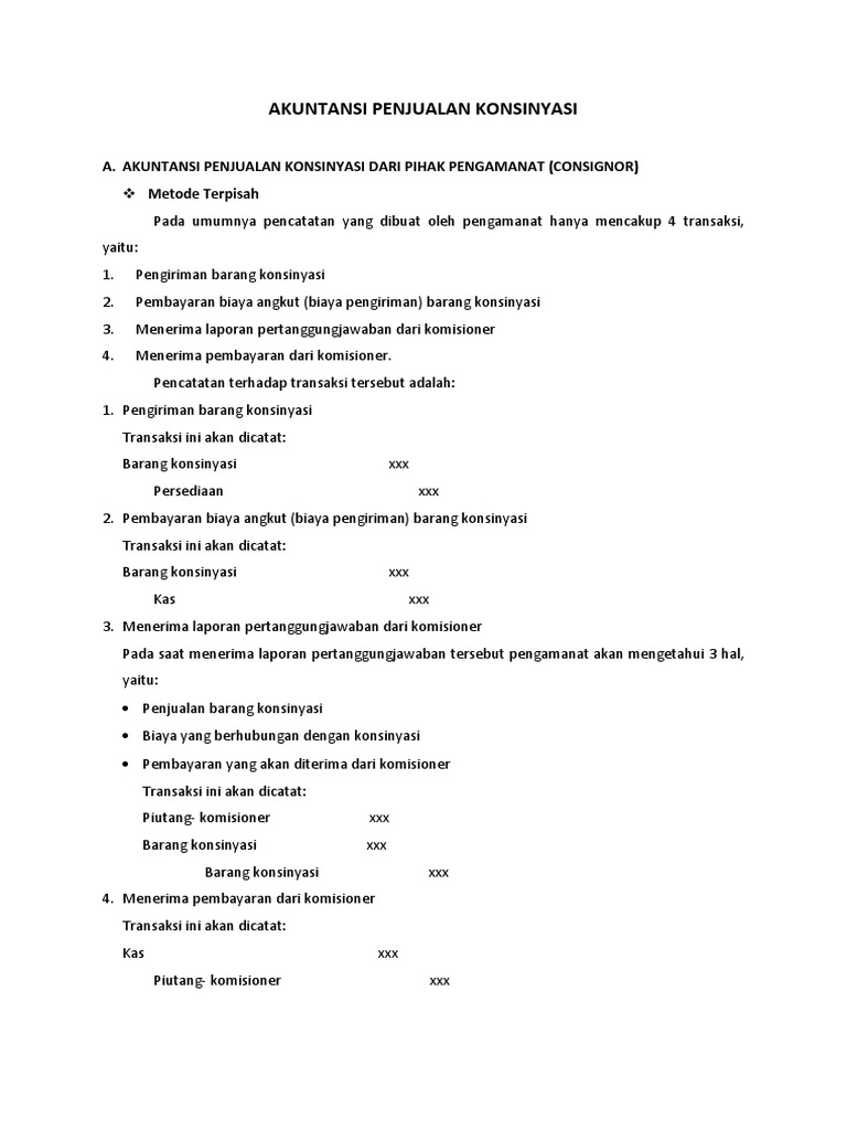Http Repository Usd Ac Id 14636 2 012114205 Full Pdf from Critical review detecting fraudulent financial re. Aulia mengirimkan 100 buah tv berwarna atas dasar konsinyasi kepada agen penjual<b> tv tersebut harus dijual dengan harga !p..#$0.000<b>% dengan harga &okok !p. Buat akun baru dengan type cogs dari menu list > chart of account > new (harga pokok penjualan konsinyasi). Contoh konsinyasi pada metode terpisah dan tidak terpisah. Sistem pemasaran dengan cara menitipkan produk atau barang ke toko atau warung yang pembayarannya dilakukan setelah barang laku terjual dinamkan sistem pemasaran apa? Hasil penjualan barang konsinyasi berdasarkan laporan perhitungan penjualan dari komisioner, dicatat kredit akun penjualan konsinyasi. Dewasa indonesia saat ini mengalami perkembangan dan stabilitas yang sangat pesat dalam bidang fashion mode, teknologi dan seni desain. Pada tanggal 1 februari, perusahaan a mengirimkan 100 produk baju kepada pihak b yang akan menjualnya.